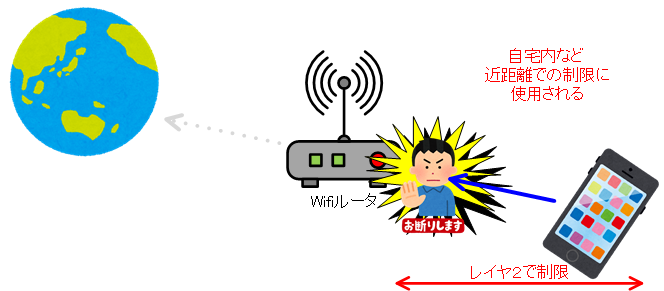 MACアドレスは、スマホやパソコンといった端末のインタフェースに製造メーカが付与する番号で、ユーザが好き勝手に変更することはできません。MACアドレスを使った通信制限は、「通信を確実に制限できる」「アドレス管理が不要」というメリットがあります。もちろん、端末に固有で割り当てられたアドレスなので、端末が変われば設定変更が必要です。WiFiルータに搭載されているMACアドレスフィルタやキッズタイマーは、MACアドレスを使うのでレイヤ2の制限機能です。レイヤ2の制限機能は、自宅内などWiFiルータと端末が隣接する近距離の通信に限られます。