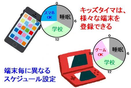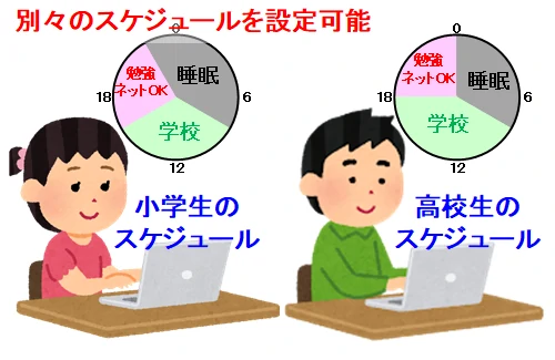 小学生の娘と高校生の兄では、学校から帰ってくる時間も、塾の時間帯も異なります。利用者の生活リズムに合わせて、スマホを使える時間をスケジュール管理することは、インターネット利用制限にも効果的です。