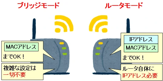 これは、それなりにネットワークの知識を持った人でないとできないことです。そこで、一部の製造メーカは、ルータモードを動作条件にしているのです。