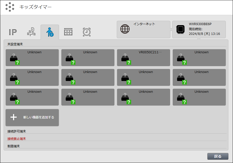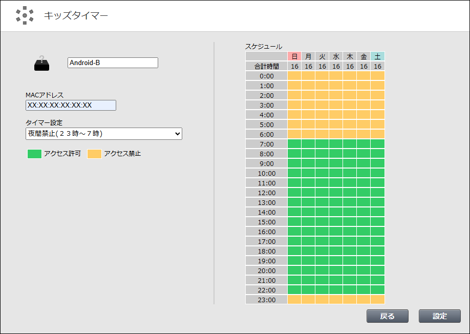 キッズタイマーは、端末が持つMACアドレスごとに、インターネット接続をスケジュール管理する機能です。