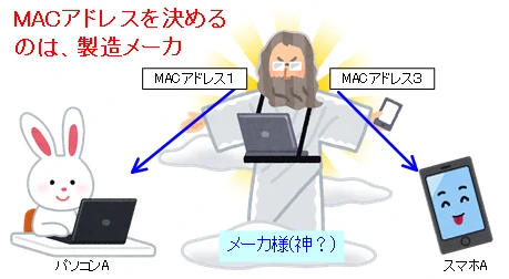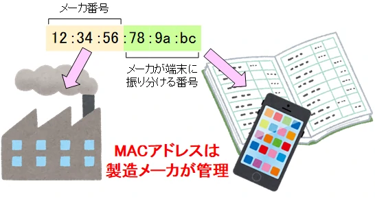 製造メーカが割り付けるMACアドレスは、メーカの厳密なMACアドレス管理により、重複させないという条件があるので、MACアドレスで端末の通信ポートを区別することができます。