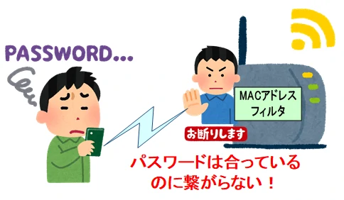MACアドレスフィルタの本来の目的は、WiFiルータに接続できる端末を絞り込むことであり、未登録端末のWiFi接続を制限できない拒否リスト方式の問題は、特定できない侵入者を排除できないことです。