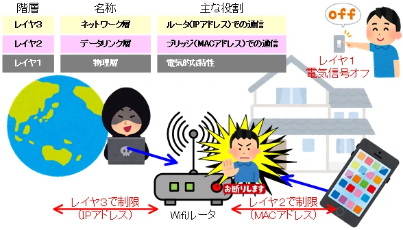 次に、WiFiルータに搭載されたインターネット利用の制限機能について説明します。ルータとは、英語でRouterと表記されるように伝送経路を決めるネットワーク装置です。OSI参照モデルでは、レイヤ1~レイヤ3を制御することができます。レイヤの違いを超ザックリに説明すると次のとおりです。