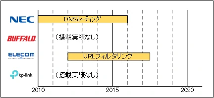 これを逆手にとって、制限したいURLを、実際にはDNSが動作していない、もしくは、存在すらしないサーバに変更してしまうことで、このURLへの接続を無効にしてしまいます。ただし、この機能は、残念ながら現行機種に搭載されていません。星になってしまったレジェンド機能です。ただし、特定のドメイン名を持つサーバへのアクセスを制限することができるので、とても有能な機能です。もし、中古でWiFiルータを購入することをお考えなら、DNSルーティングが搭載された製品を選ばれることをおススメします。