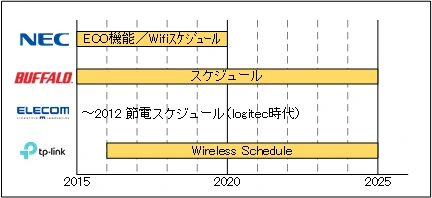 WiFiルータには、無線WiFiの停波、有線LANの停止を行う「省電力設定」が実装された製品があります。詳しくは、下記の記事を参考にしてください。