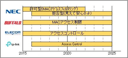 なお、キッズタイマーが登場した際に、MACアドレスの管理方式は、許可リスト方式と拒否リスト方式の2種類に分裂しました。MACアドレスフィルタは、許可リスト方式をおススメします。詳しくは、次の記事を参考にしてください。