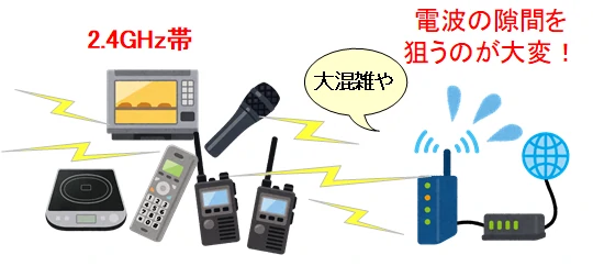 特に2.4GHz帯は、 電子レンジ、IHクッキングヒータ、工業用マイクロ波加熱装置などに使用されています。もちろん、通信に使ってはダメという訳ではなく、コードレス電話やbluetooth、アマチュア無線などにも使用されています。無線LAN以外にも、様々なものに使われており、常に帯域が使用されている状態となり、場所によっては電波の混信で、安定して通信ができない状態になってしまう可能性があります。