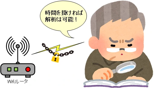 有線接続は、ケーブルを流れる電気信号や光信号を、物理的に分岐しないと通信内容の確認ができませんが、無線LANは、空間に飛んでいる無線信号を捉えるだけなので、誰でも通信内容を確認できてしまいます。もちろん、捉えただけでは通信内容が分からないように、暗号化したデータを無線信号で送っていますが、暗号化の歴史は、解読の歴史でもあります。